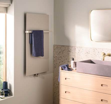 This flat-fronted steel towel rail offers a clean finish with a slim, flat vertical panel that radiates heat across the entire surface. The Accorto has the option of one or two integrated horizontal brushed stainless steel towel bars, which can be colour-matched. A range of customisation options include a choice of over 200 colours, including 188 RAL colours, 31 special finishes and six feature finishes including metallics, light surface textures and elegant matt options. Designers can use the towel rail to create both bold statement pieces and subtle, minimalistic features, depending on the desired aesthetic.