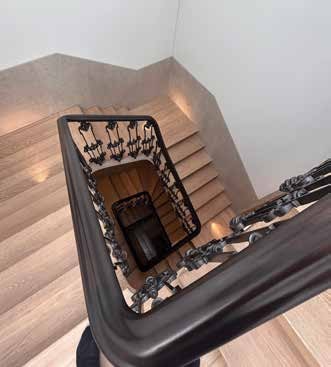 The most effective staircase schemes take a ‘hybrid restoration’ approach, where the historic staircase becomes a framework for new architectural interventions. Original elements such as newel posts, spindles and handrails can be dismantled, restored and adapted to integrate with the updated supporting structure. The unique character of each piece adds visual interest and preserves heritage value, while enhancing sustainability through re-use.